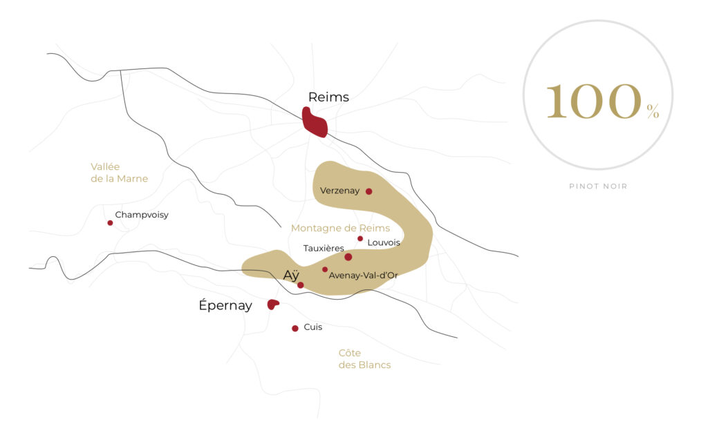 Situated on the southwest slopes of the Montagne de Reims, the Tauxières cru benefits from a unique exposure and soil, blending chalk and clay, creating ideal conditions for the Pinot Noir to thrive. This prestigious vineyard is renowned for the freshness, elegance, and aromatic complexity it imparts to the wines. It is from this exceptional terroir that the PN TX20 cuvée draws its structure, precision, and distinctive character.