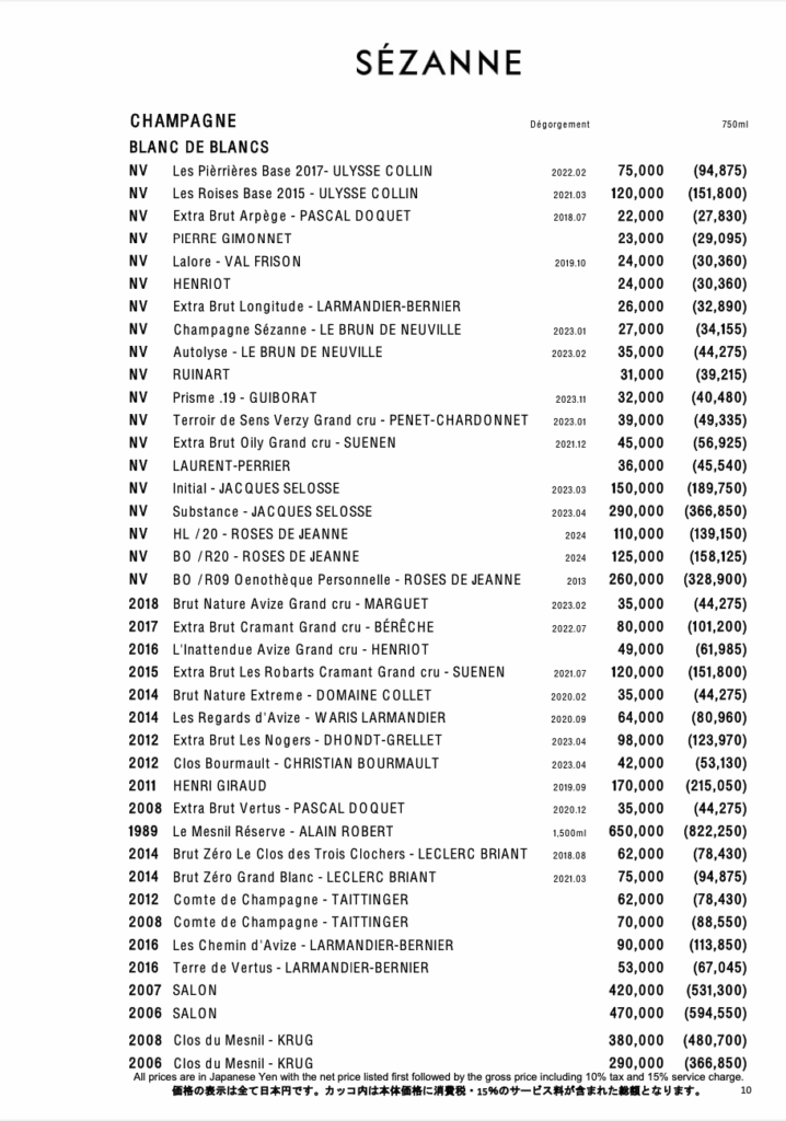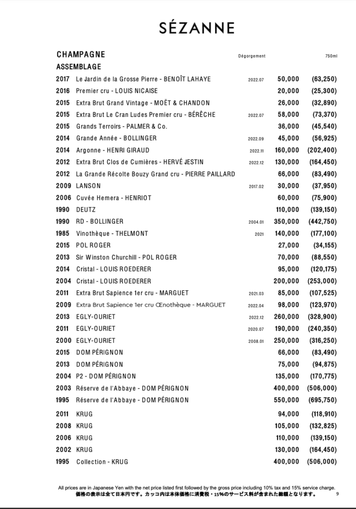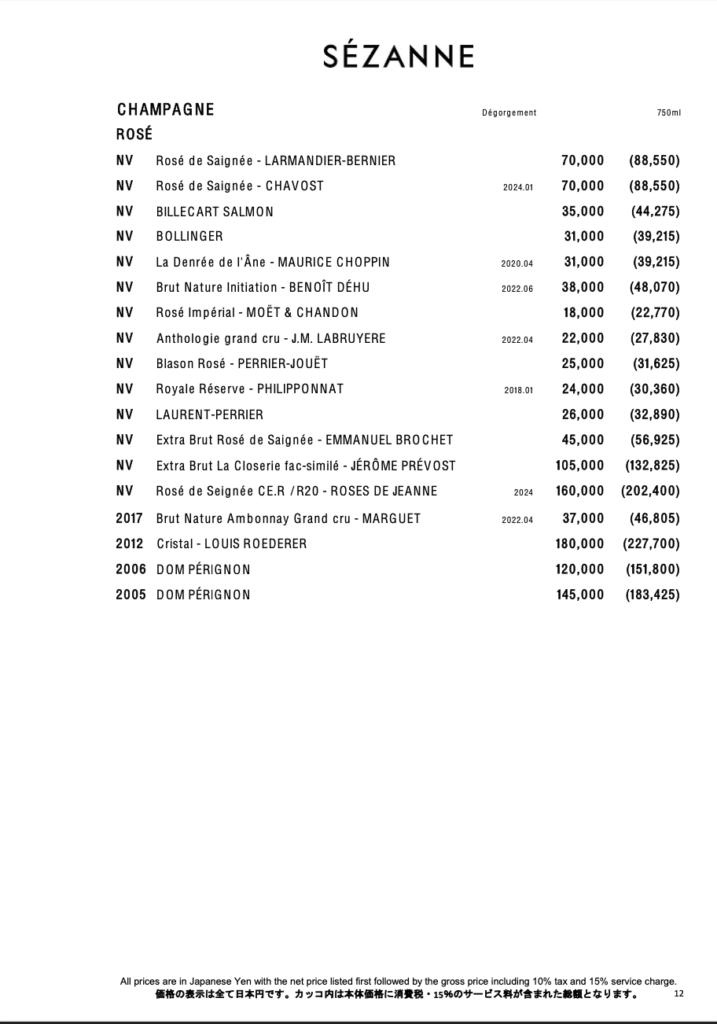 The Champagne selection at SÉZANNE is notably comprehensive, offering a wide array of options across different styles, producers, and price points. The list details the Dégorgement date for many non-vintage (NV) Champagnes and vintages for others, along with their prices in Japanese Yen, followed by a parenthetical value that appears to include tax or service charge.