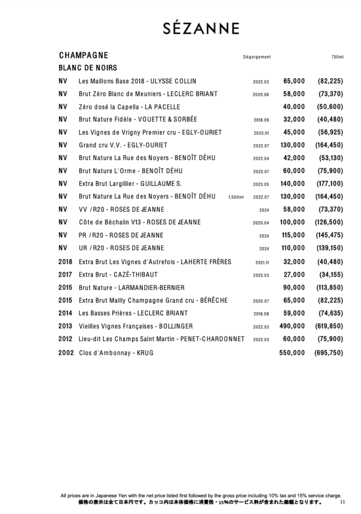 - LE BRUN DE NEUVILLE NV Champagne Sézanne: ¥27,000 (¥34,155), a particularly relevant bottle given the restaurant’s name.